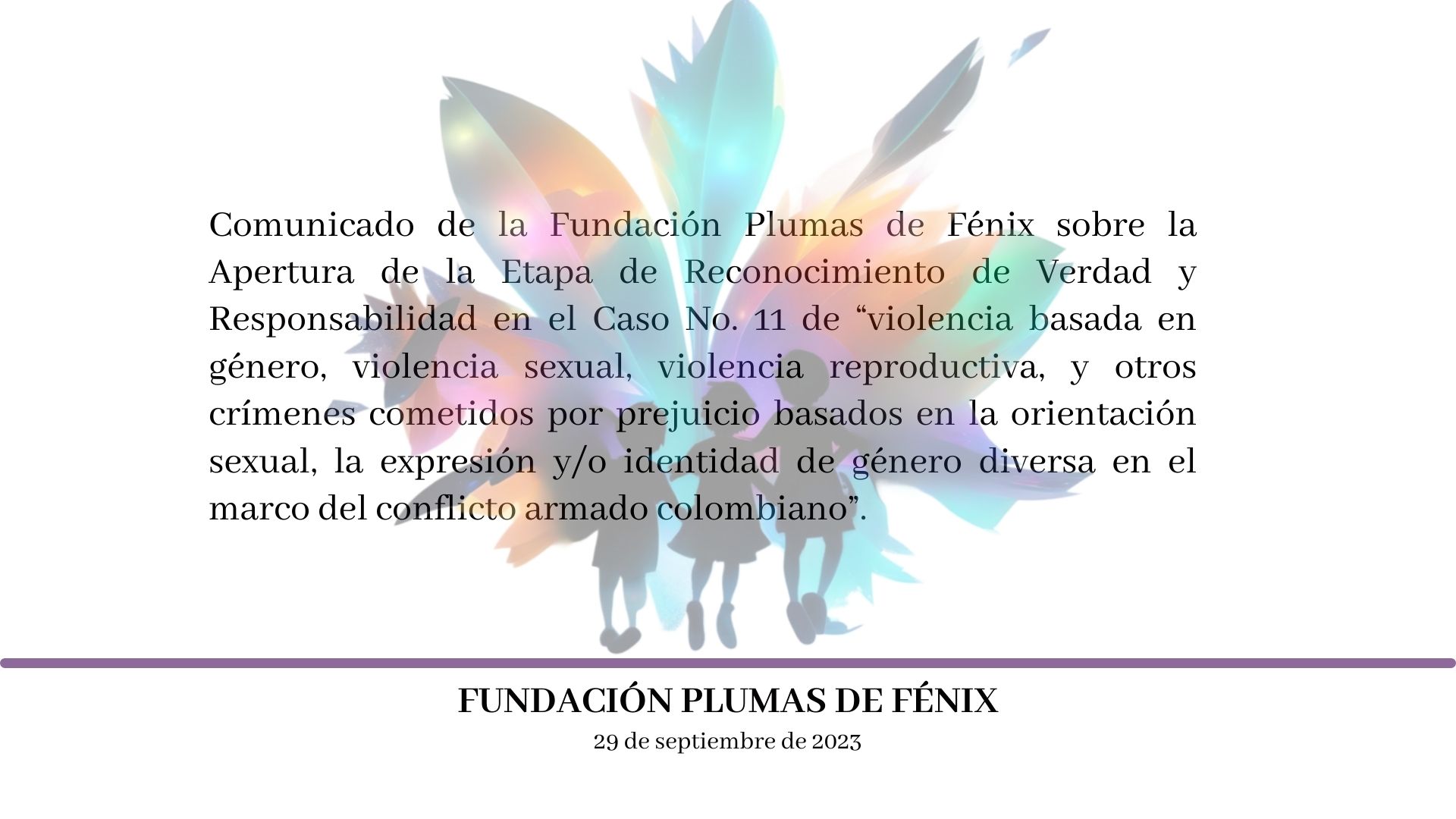 Comunicado de la Fundación Plumas de Fénix sobre la Apertura de la Etapa deReconocimiento de Verdad y Responsabilidad en el Caso No. 11 de “violencia basadaen género, violencia sexual, violencia reproductiva, y otros crímenes cometidos porprejuicio basados en la orientación sexual, la expresión y/o identidad de génerodiversa en el marco del conflicto armado colombiano”. septiembre 29, 2023 Read more